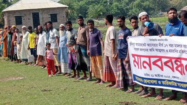 মঙ্গলবার (২১ অক্টোবর) সকালে ছোনখোলা ও তারিকাটা এলাকার সাধারণ জনগণের আয়োজনে এ মানববন্ধন অনুষ্ঠিত হয়। পরে অংশগ্রহণকারীরা বিক্ষোভ মিছিল করেন। প্রায় দুই শতাধিক ভুক্তভোগী এতে অংশ নেন।